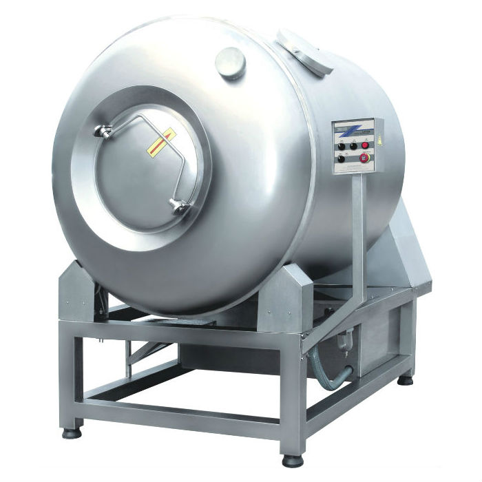 製冷滾揉機是在真空狀(zhuàng)態下,利用物理衝(chōng)擊(jī)原理,讓(ràng)物料在滾筒內上(shàng)下翻動,相互撞擊摩擦,產生大麵(miàn)積均勻分布的按摩和醃漬作用,使淹製(zhì)液在物料內均勻分布更加(jiā)有利於(yú)鹽溶性蛋白質以較快的速度較大(dà)限度地淅(xī)出(chū),從而增加(jiā)產品的持水性,很好地改善產品的彈性,切片性和口感,大程度上提高產品的出品率。
