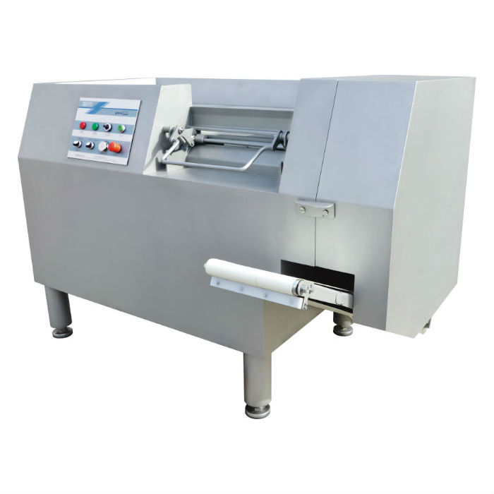 2、采用PLC程序控製設(shè)計,操作簡便、設計合理、可調整刀速和自動預(yù)壓縮係統保證肉塊的6個麵的精確性;