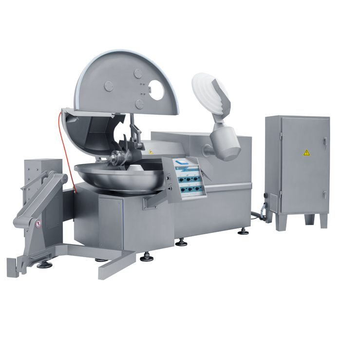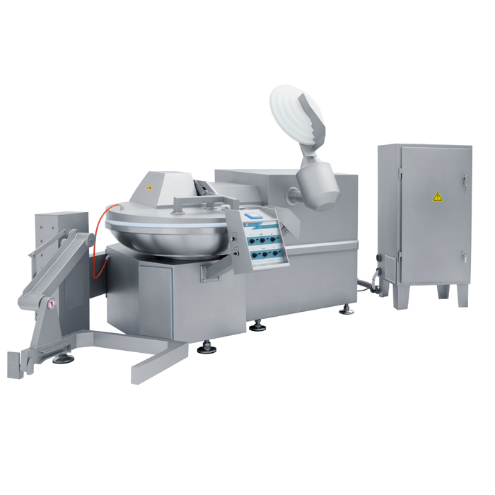 斬鍋(guō)由電機(jī)通過減速機低速(sù)旋轉,不斷向刀組送料。刀軸由雙速電機(或變(biàn)頻電(diàn)機)經皮帶(dài)帶動高速旋轉。原料在(zài)斬鍋中作螺旋式運動的同時,被(bèi)刀組攪拌和切碎(suì)並排除肉糜中(zhōng)的空氣,由於切刀的高速斬切,減少了產品的液(yè)汁分離(lí)率,保證(zhèng)了乳化效果,增強(qiáng)了產品的彈性和細膩度。