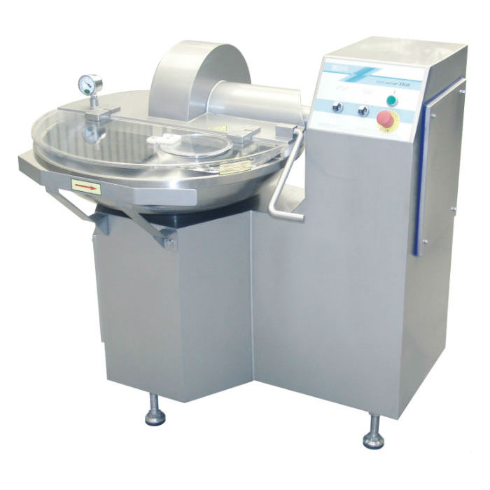 斬鍋由電機通過減速機低速旋轉,不斷向刀組送料。刀軸由雙速電機(或變頻電機)經(jīng)皮帶帶動高速(sù)旋轉。原料在斬(zhǎn)鍋中作螺(luó)旋式運動的同時,被刀組攪拌和切碎並排除肉糜中的空氣,由於切刀的高速斬切,減少了產品(pǐn)的液汁分離率,保證了乳(rǔ)化效果,增強了產品(pǐn)的彈性和細膩度。